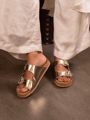 Three-Strap Beige Block Heels with Multicolour Jewels